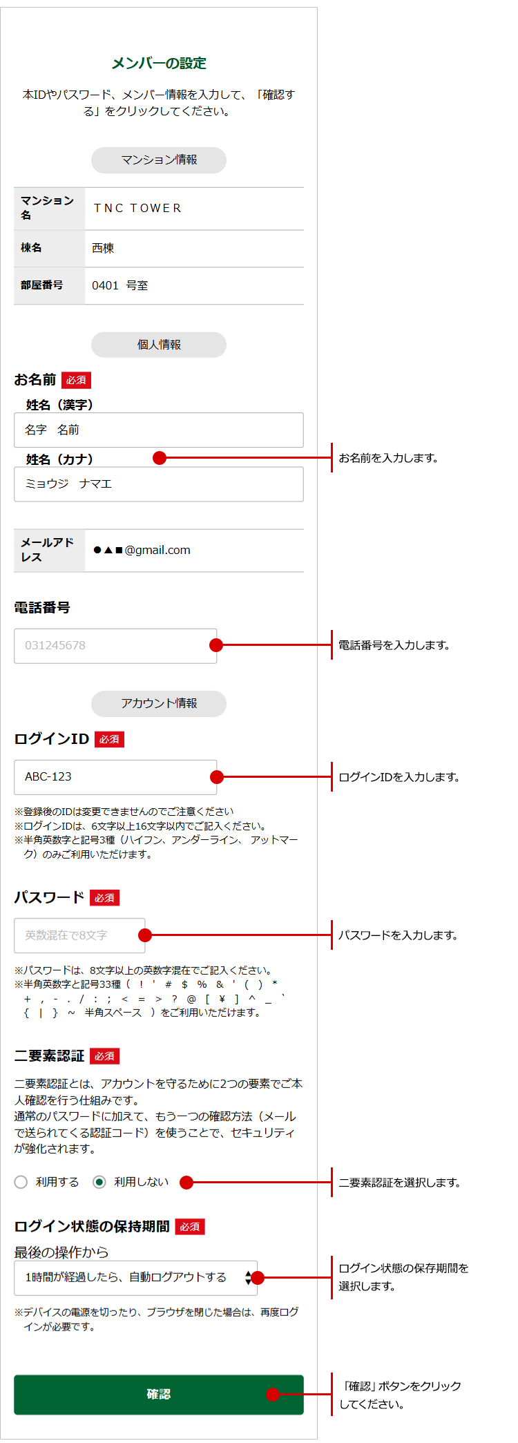 「ログインID」の欄には、あらかじめ「仮ID」が表示されています。