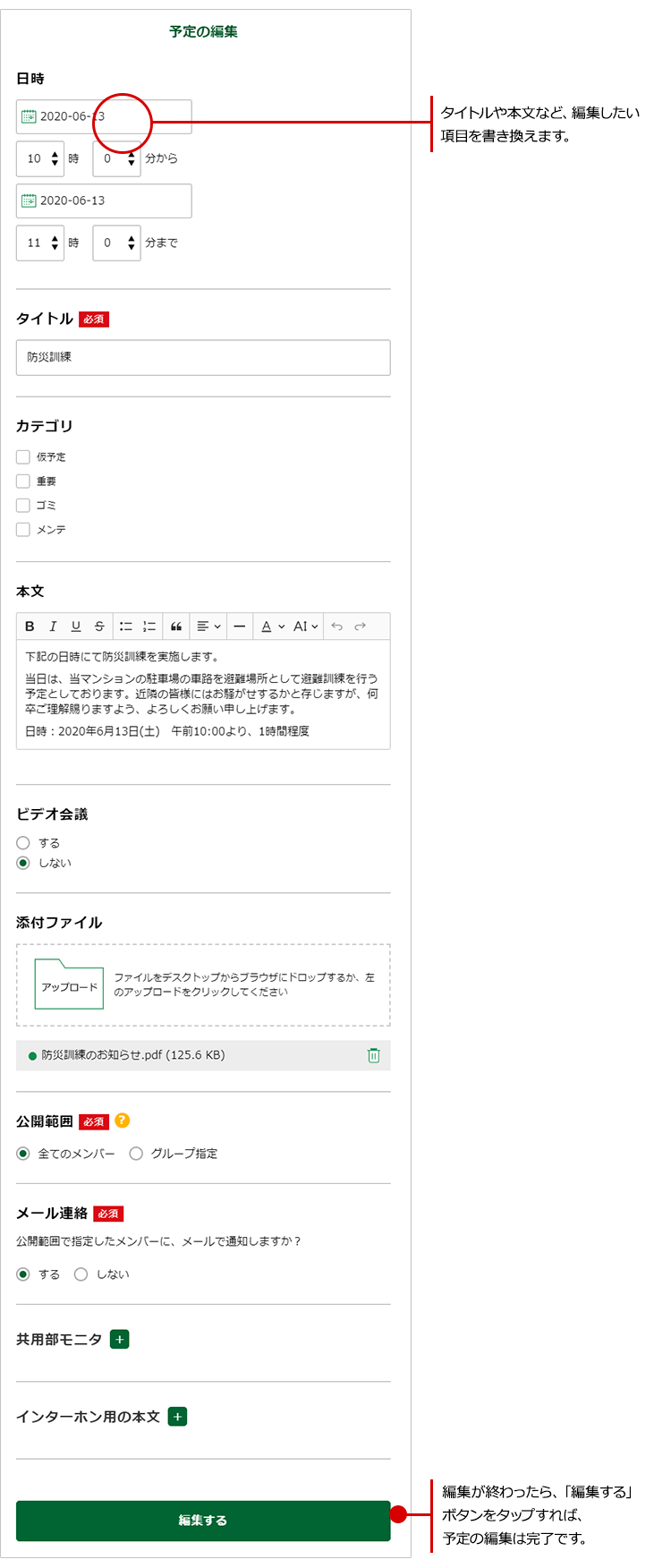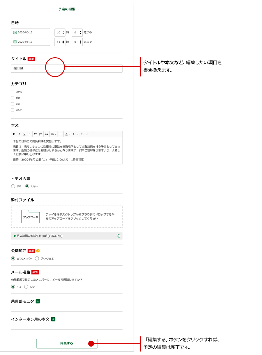 編集が終わったら、「編集する」ボタンをクリックすれば、予定の編集は完了です。