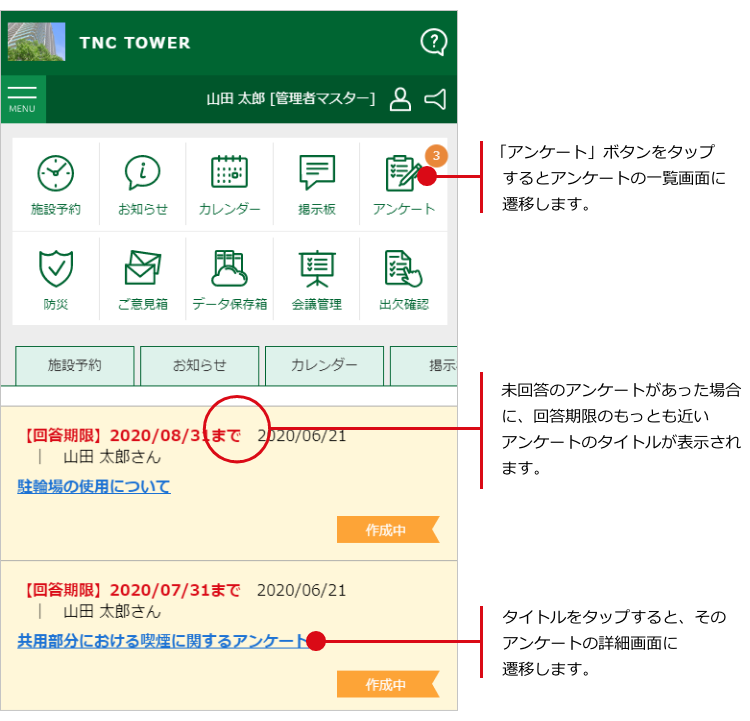 ホーム画面には、未回答のアンケートがあった場合に、回答期限のもっとも近いアンケートのタイトルが表示されます。