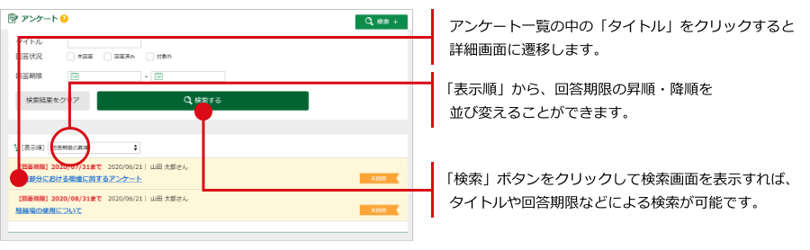 「表示順」から、回答期限の昇順・降順を並び変えることができます。