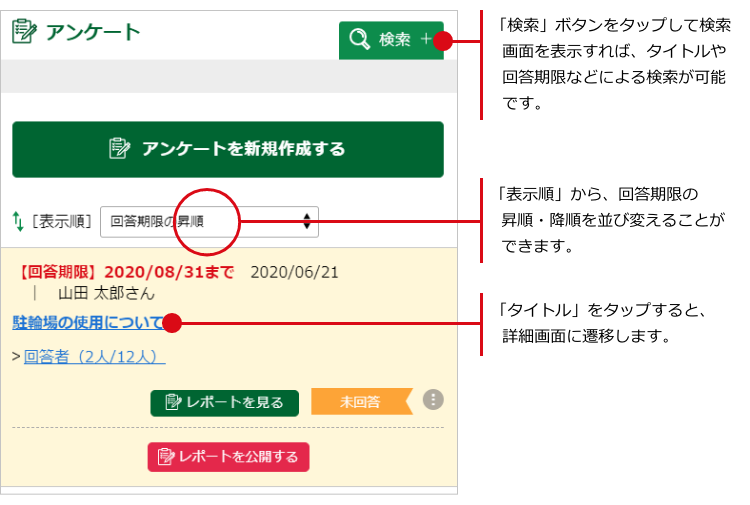 また、「検索」ボタンをタップして検索画面を表示すれば、タイトルや回答期限などによる検索が可能です。
