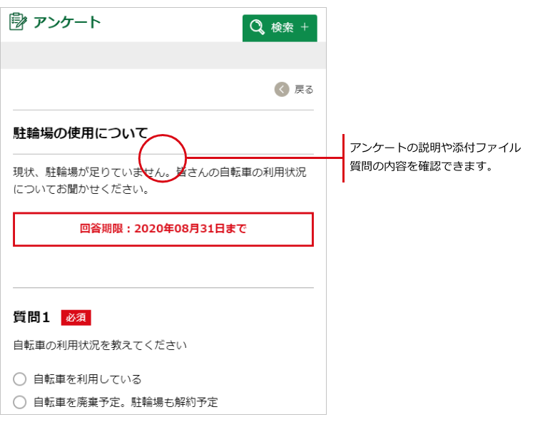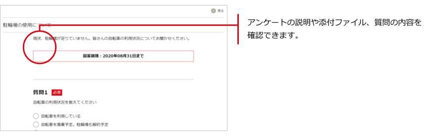 アンケートの説明や添付ファイル、質問の内容を確認できます。
