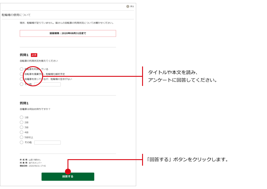 タイトルや本文を読み、アンケートに回答したら、「回答する」ボタンをクリックします。