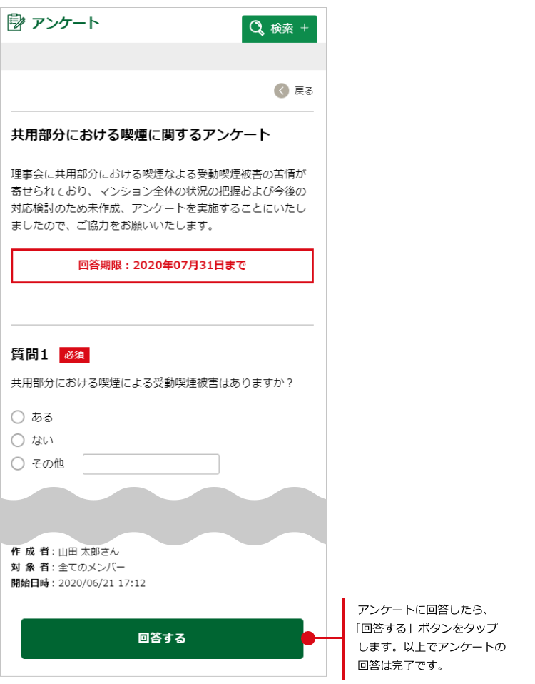タイトルや本文を読み、アンケートに回答したら、「回答する」ボタンをタップします。
