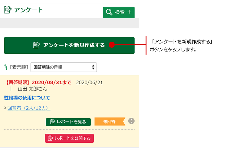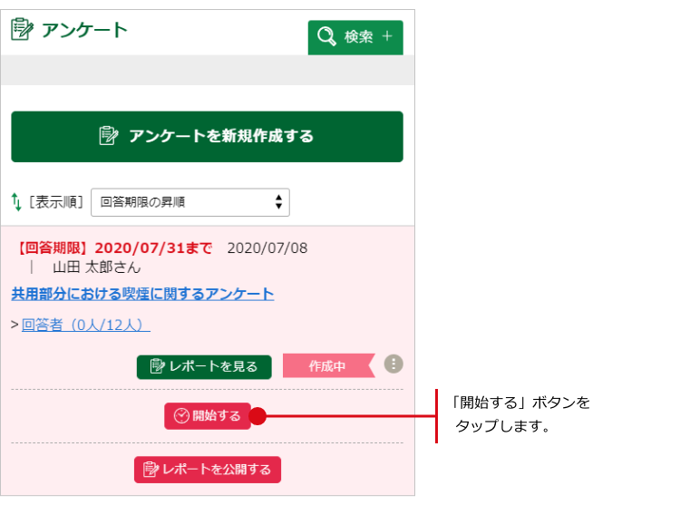 「アンケート」ページにある「アンケートを新規作成する」ボタンをタップします。