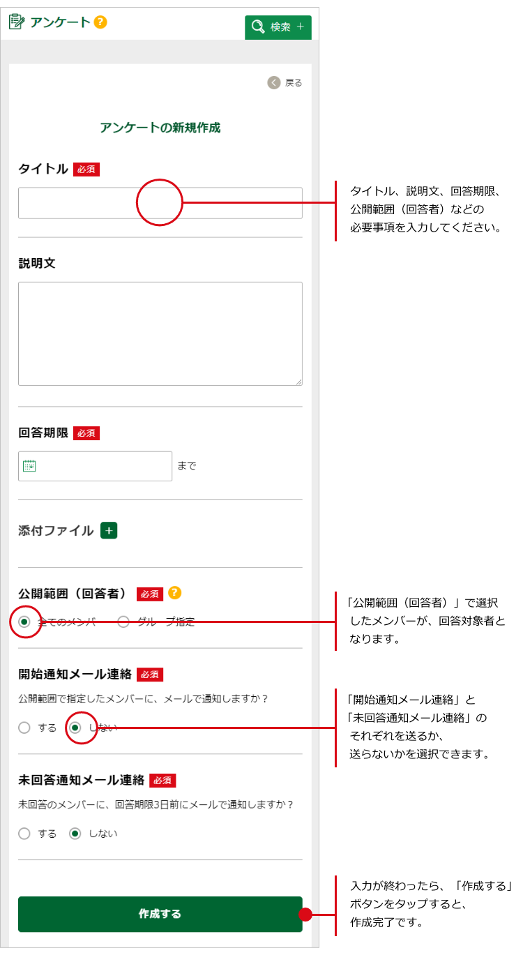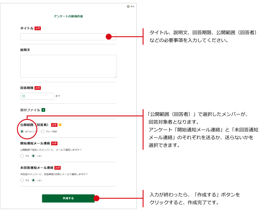 タイトル、説明文、回答期限、公開範囲(回答者)などの必要事項を入力してください。添付ファイルをつけることも可能です。
