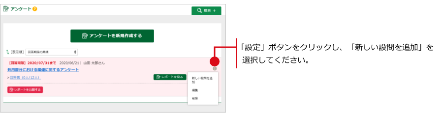 「設定」ボタンをクリックし、「新しい設問を追加」を選択してください。