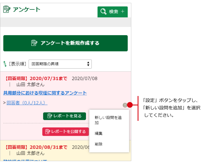 「設定」ボタンをタップし、「新しい設問を追加」を選択してください。