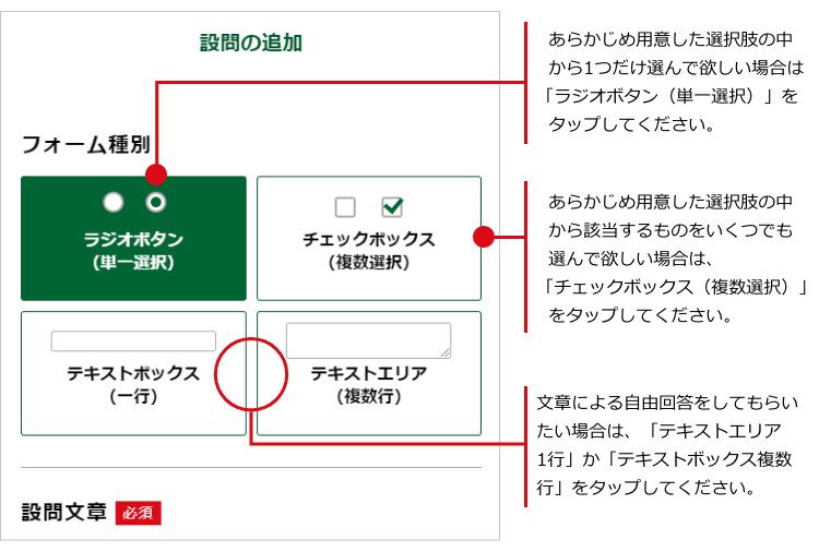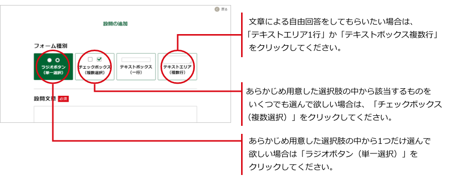 質問に対する回答方式に応じて、フォーム種別を選択してください。