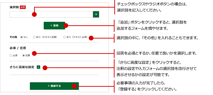 「追加」ボタンをクリックすると、選択肢を追加するフォームを増やせます。
