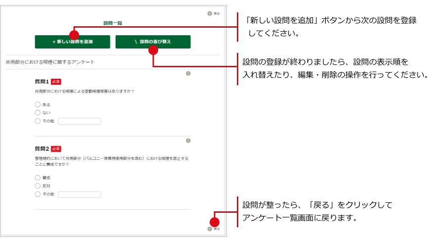 設問の登録が終わりましたら、設問の表示順を入れ替えたり、編集・削除の操作を行ってください。