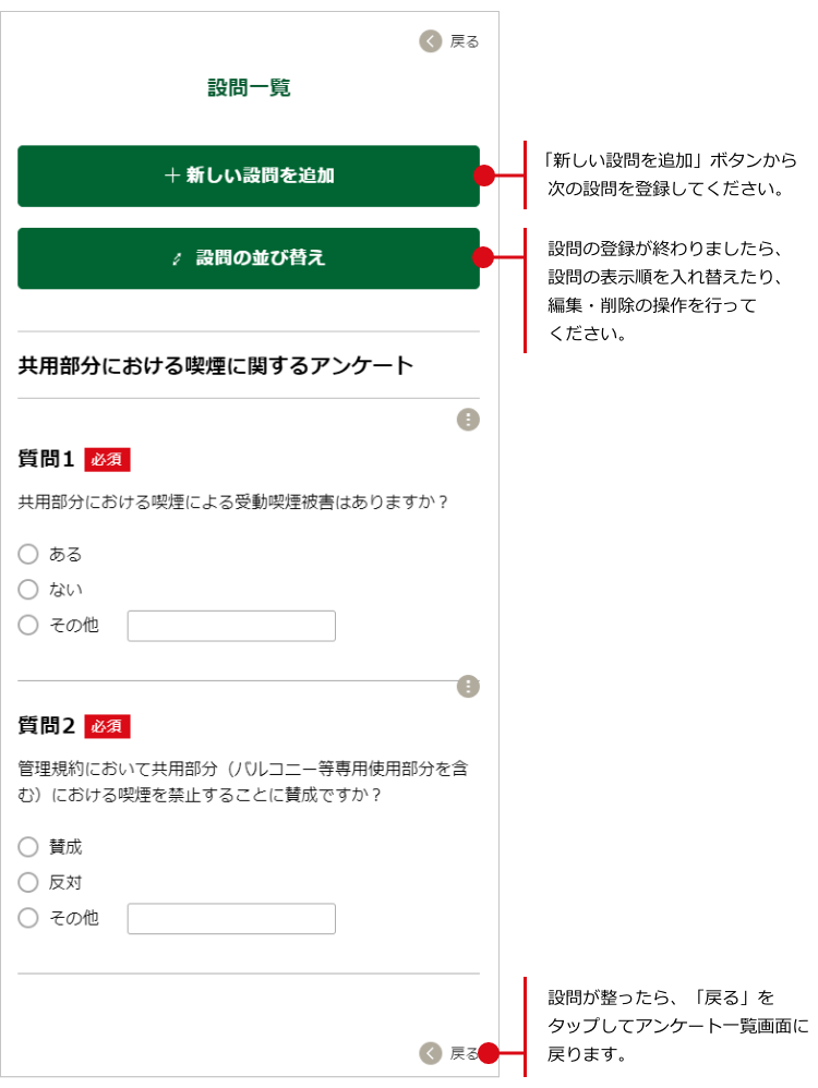 設問が整ったら、「戻る」をタップしてアンケート一覧画面に戻ります。