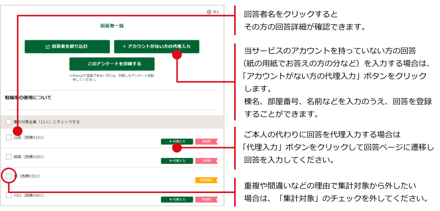 当サービスのアカウントを持っていない方の回答(紙の用紙でお答えの方の分など)を入力する場合は、