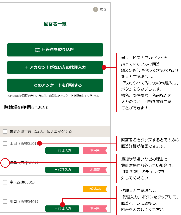 アンケートの回答状況の確認や、代理入力などの手順についてご案内します。