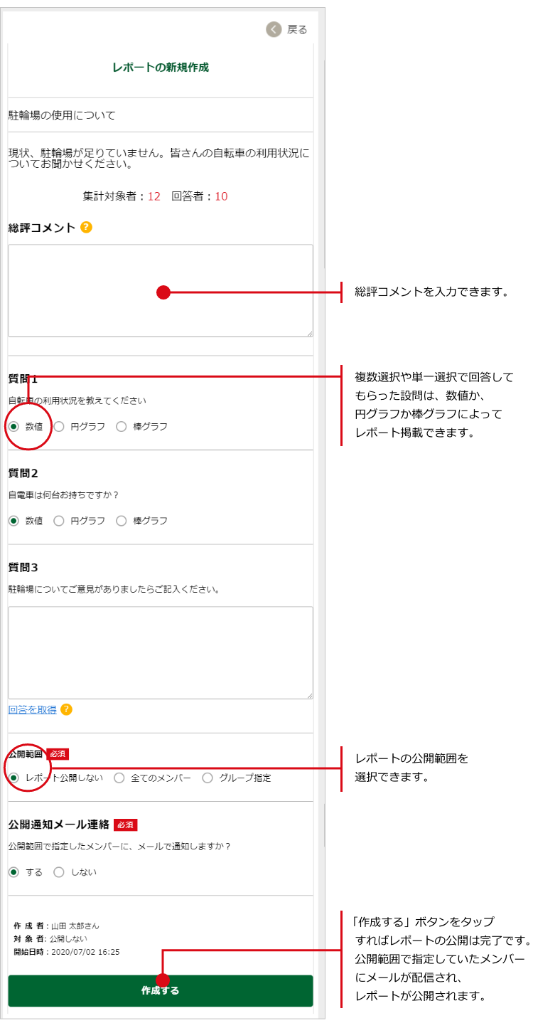 問題なければ「作成する」ボタンをタップすれば、レポートの公開は完了です。
