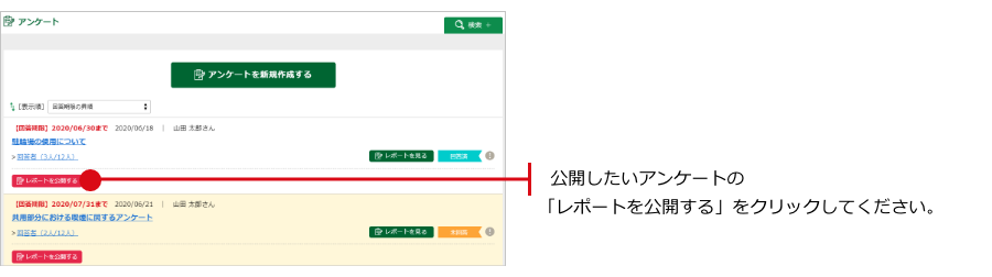 編集したいアンケートの「レポートを公開する」をクリックしてください。