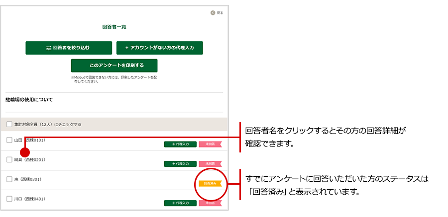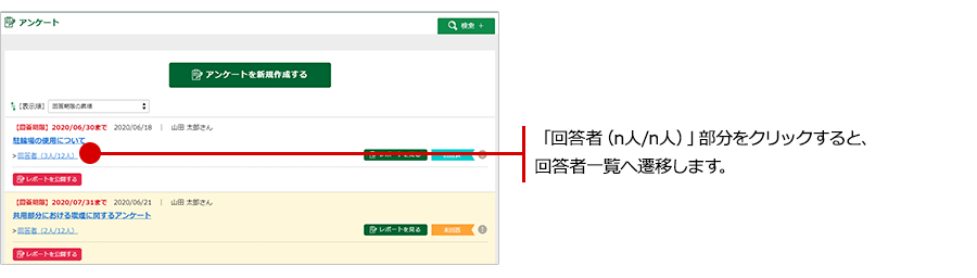 アンケートの回答期限前に、途中経過の回答を確認することは出来るのか? アンケートの途中経過を確認する方法をご案内します。 ■閲覧可能な権限 管理者マスター、管理者A ■ステップ1 アンケート一覧画面の「回答者(n人/n人)」部分をクリックすると、回答者一覧へ遷移します。 ■ステップ2 すでにアンケートに回答いただいた方のステータスは「回答済み」と表示されています。 回答者名をクリックするとその方の回答詳細が確認できます。