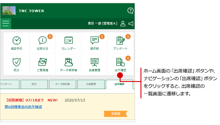 ホーム画面の「出席確認」ボタンや、ナビゲーションの「出席確認」ボタンをクリックすると、出席確認の一覧画面に遷移します。