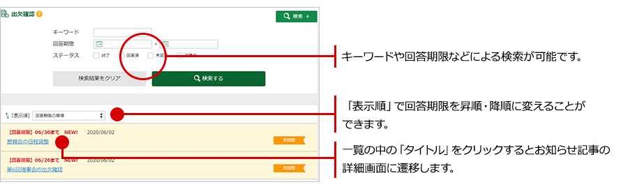 出欠確認一覧の「表示順」で回答期限を昇順・降順に変えることができます。