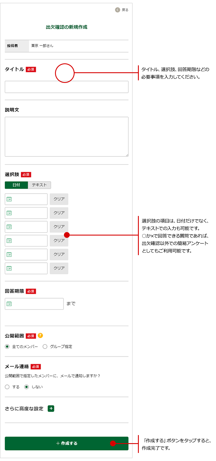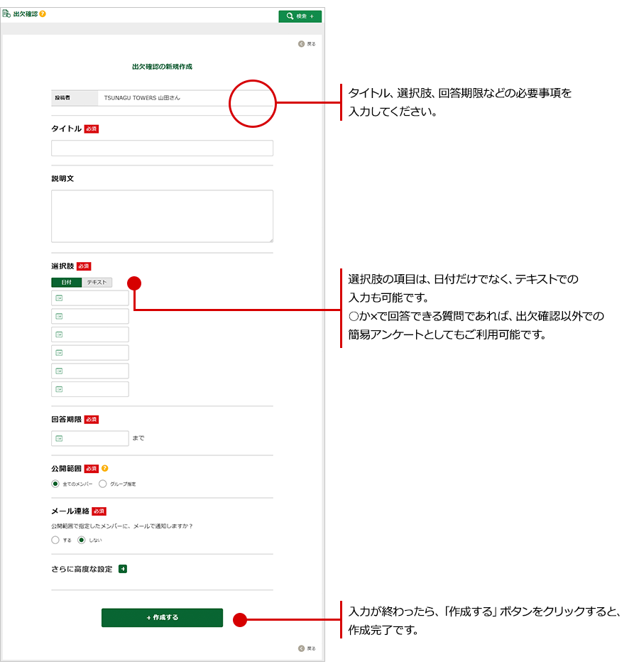 タイトル、選択肢、回答期限などの必要事項を入力してください。