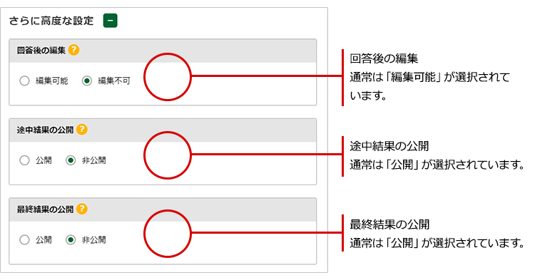「編集可能」選択時は、回答者が1度回答した後も、回答期限が来るまでなら何度でも回答内容を変更できます。