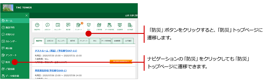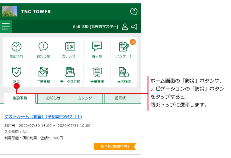 ホーム画面の「防災」ボタンや、ナビゲーションの「防災」ボタンをクリックすると、