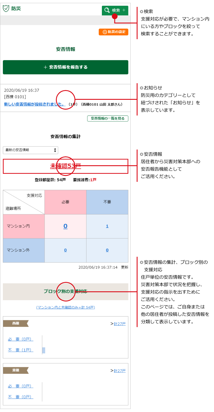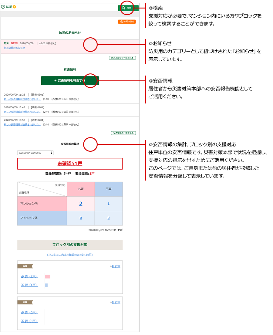 住戸単位の安否情報です。災害対策本部で状況を把握し、支援対応の指示を出すためにご活用ください。