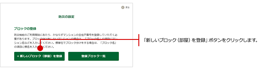 「ブロックの登録」から、「新しいブロック(部屋)を登録」ボタンをクリックします。