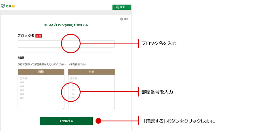 ブロック名と部屋番号を入力して、「確認する」ボタンをクリックします。