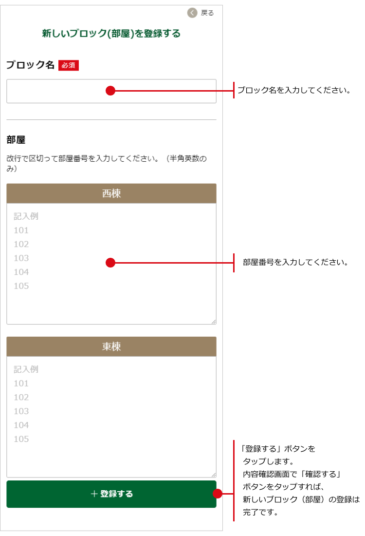 内容確認画面で、「登録する」ボタンをタップすれば、新しいブロック(部屋)の登録は完了です。