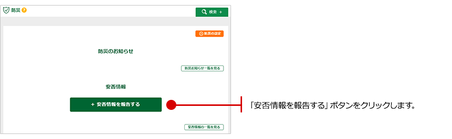 防災トップの「安否情報を報告する」ボタンをクリックします。