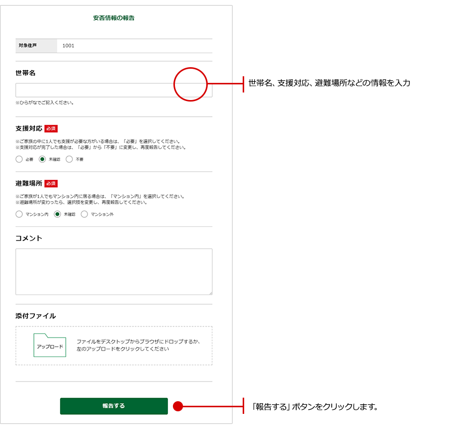 世帯名、支援対応、避難場所などの情報を入力して、「報告する」ボタンをクリックすれば、安否報告の登録は完了です。