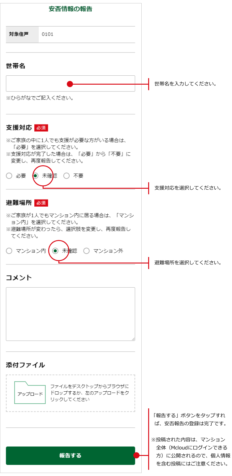 世帯名、支援対応、避難場所などの情報を入力して、「報告する」ボタンをタップすれば、安否報告の登録は完了です。