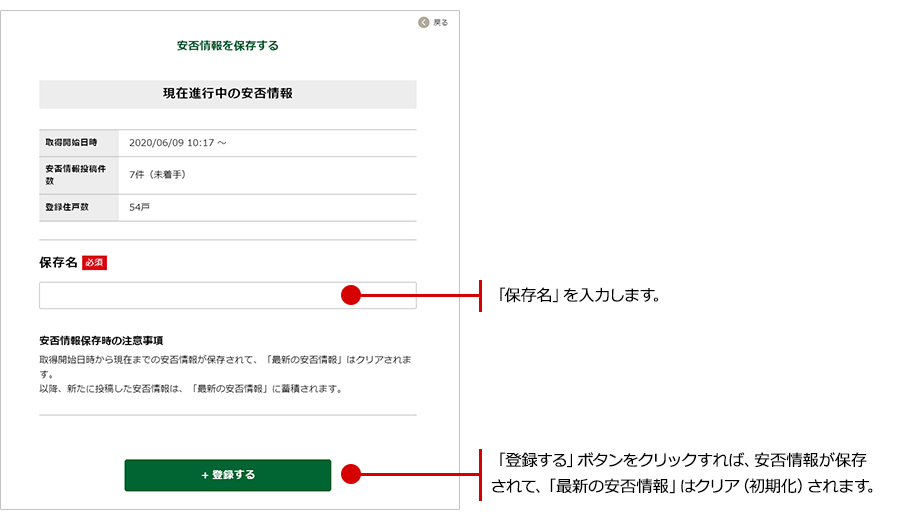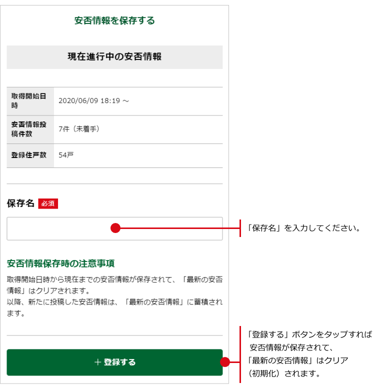 「保存名」を入力して、「登録する」ボタンをタップすれば、安否情報が保存されて、「最新の安否情報」はクリア(初期化)されます。