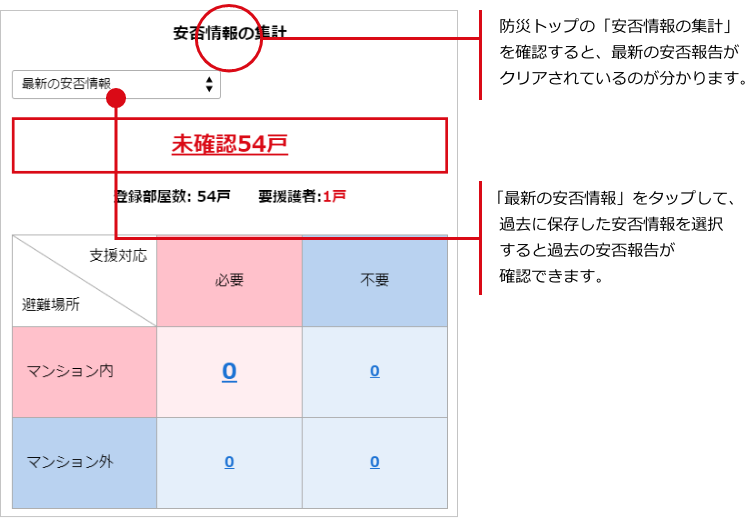 防災トップの「安否情報の集計」を確認すると、最新の安否報告がクリアされているのが分かります。