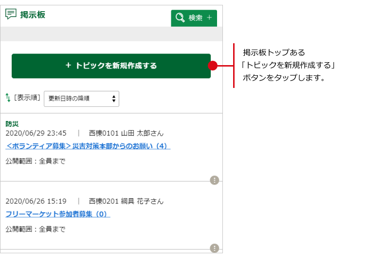 ※居住者Aと居住者Bは、トピック作成権限が「居住者も自由に」の設定になっていれば、新規作成が可能です。
