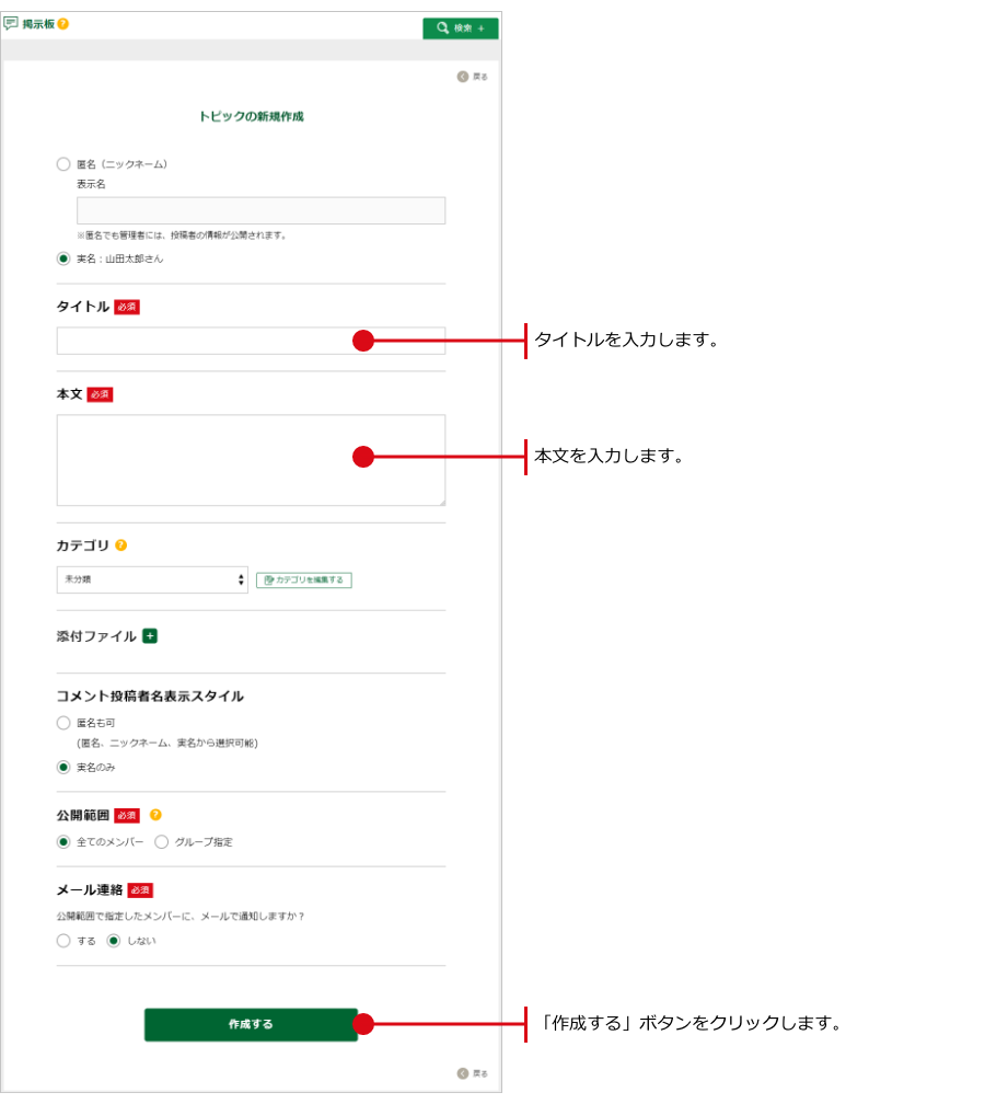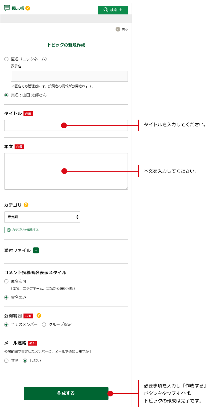 トピックの作成画面が表示されるので、タイトルや本文などの必要事項を入力し、「作成する」ボタンをタップすれば、トピックの作成は完了です。