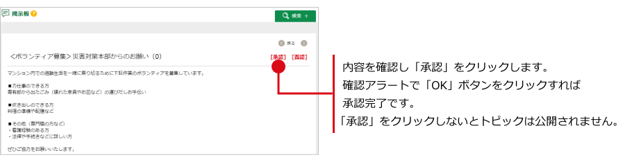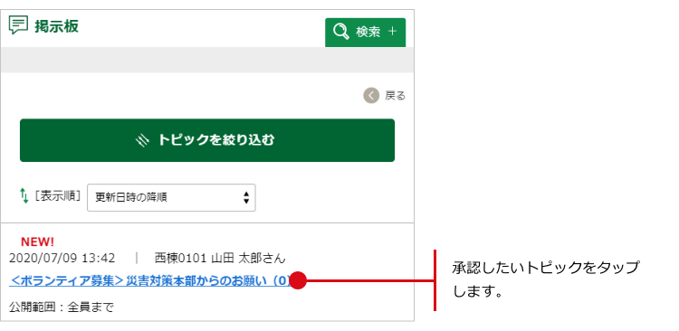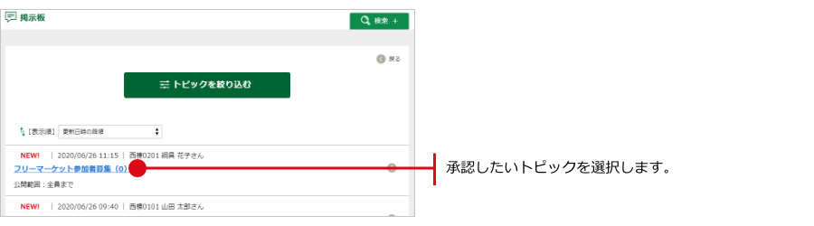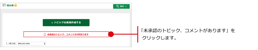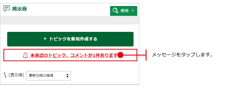 新規でトピックが作成されると、掲示板トップに「未承認のトピック、コメントがあります」と