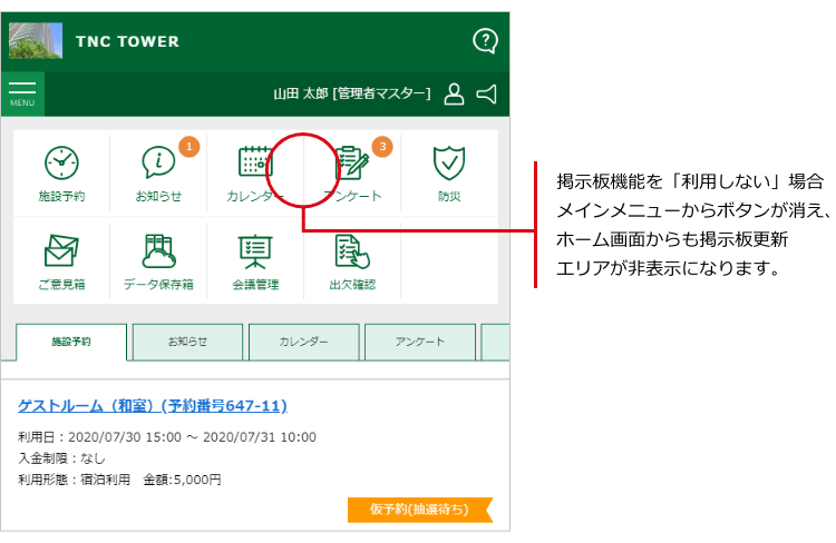 「利用しない」を選択した場合は、メインメニューからボタンが消え、ホーム画面からも掲示板更新エリアが非表示になります。