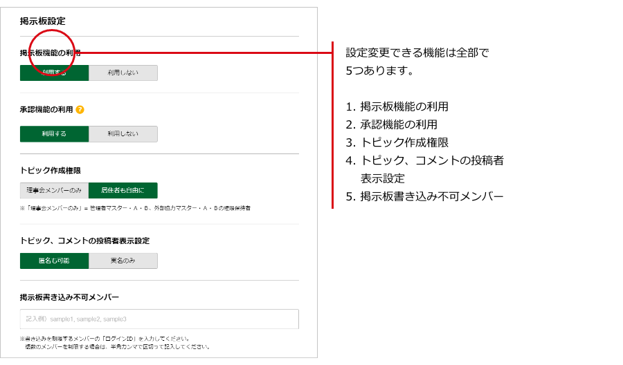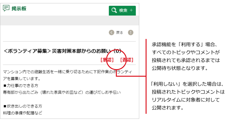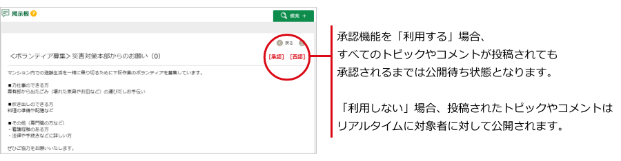 マンション理事会として、投稿されたトピックやコメントを公開する前に、人的なチェックを実施するかしないかを選択できます。