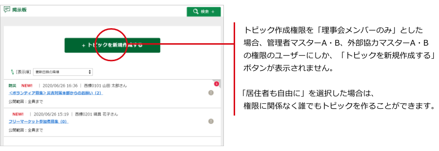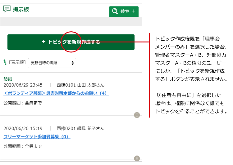 「居住者も自由に」を選択した場合は、権限に関係なく誰でもトピックを作ることができます。