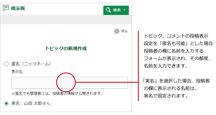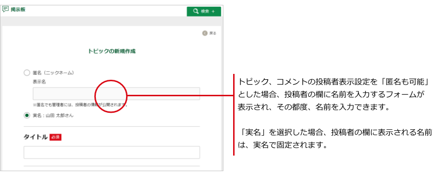 「匿名も可能」を選択した場合、投稿者の欄に名前を入力するフォームが表示され、その都度、投稿者の判断で名前を入力できます。