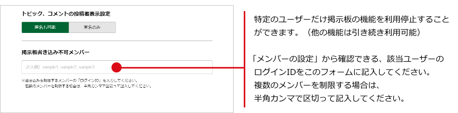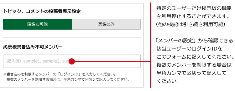 万が一、掲示板での荒らしや悪意のある投稿を続けるユーザーが居た場合に、そのユーザーだけ掲示板の機能を利用停止することができます(他の機能は引き続き利用可能)。