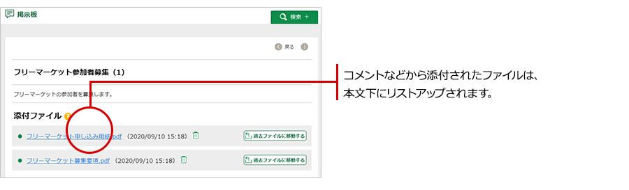 コメントなどから添付されたファイルは、本文下にリストアップされます。