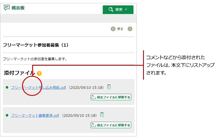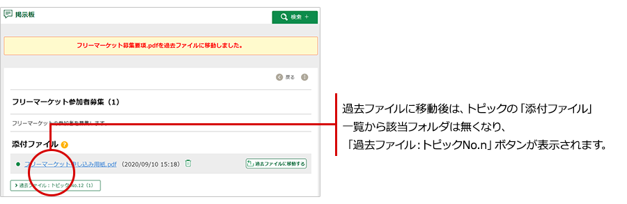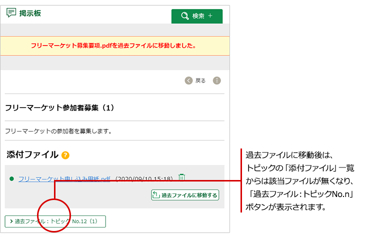「過去ファイルに移動する」ボタンをタップすると、トピックの「添付ファイル」一覧からは該当ファイルが無くなり、「過去ファイル:トピックNo.n」ボタンが表示されます。