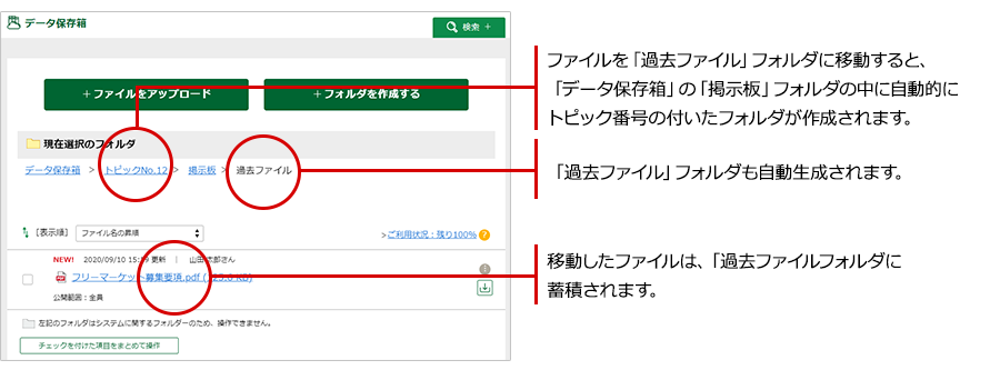 移動したファイルは、各トピックフォルダの課にある「過去ファイル」フォルダに蓄積されます。
