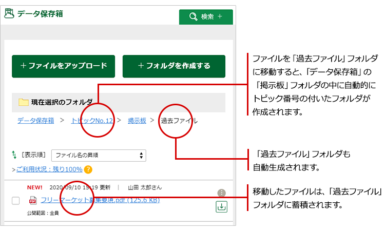 ファイルを「過去ファイル」フォルダに移動すると、「データ保存箱」の「掲示板」フォルダの中に自動的にトピック番号の付いたフォルダが作成され、その中に「過去ファイル」フォルダも自動生成されます。