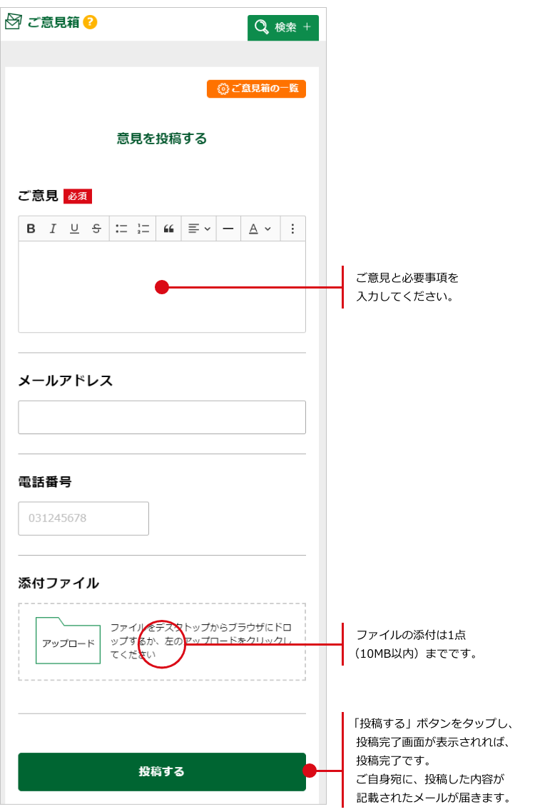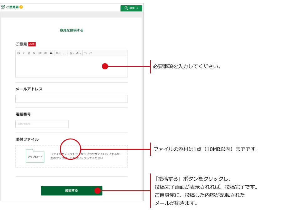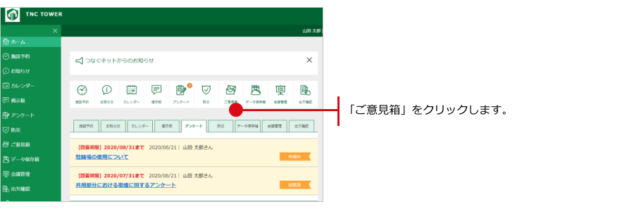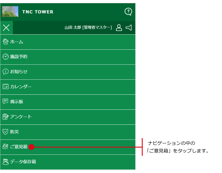 ナビゲーションの中の「ご意見箱」をクリックします。
