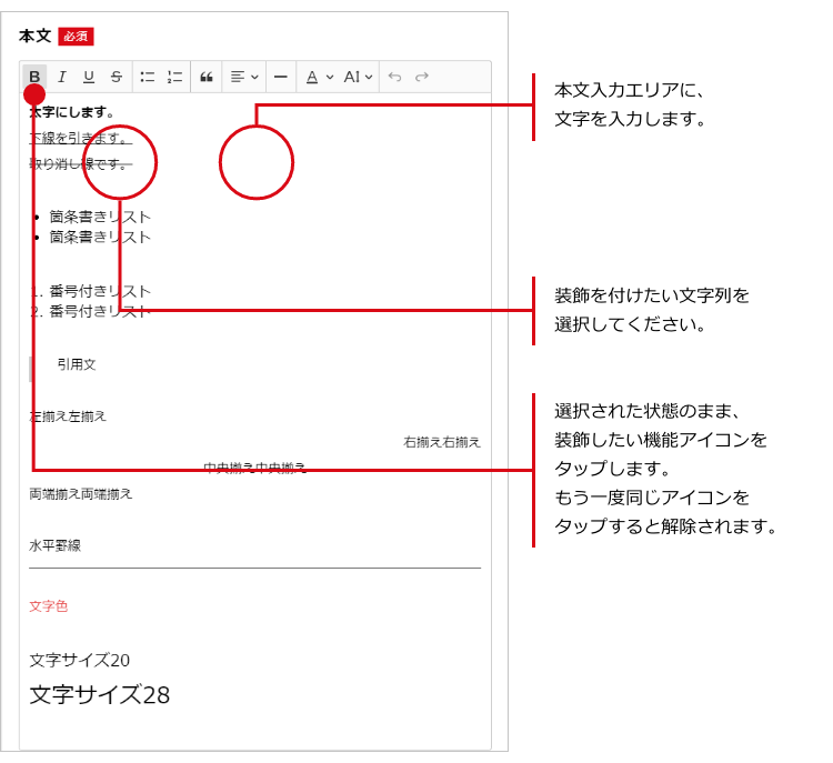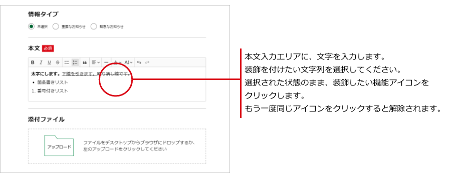 「お知らせ」と「カレンダー」の本文で、文字を装飾する方法についてご案内します。
