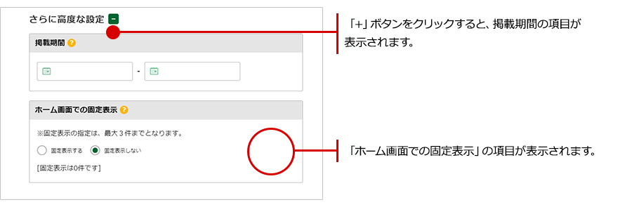 お知らせの入力画面の下部にある「さらに高度な設定」右横の「+」ボタンをクリックすると、